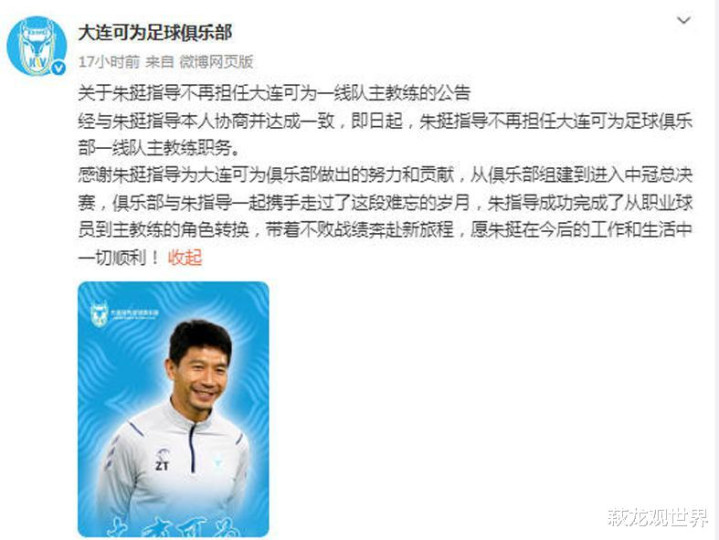 朱挺自宣:由于战绩不佳,未达到俱乐部预期标准,经与大连可为俱乐部协商:即日起,本人不再担任大连可为俱乐部主教练职位。朱挺写道:“一同战斗10轮正式比赛,共6胜4平,有惊喜也有遗憾,更多的是对自己能力不足的焦急忐忑,未来一定充分学习,夯实基础,努力提高业务水平,为大连足球做微薄的贡献,少说空话多干事实,用这次宝贵的联赛经验服务更多,对足球有理想有憧憬的球员!”
